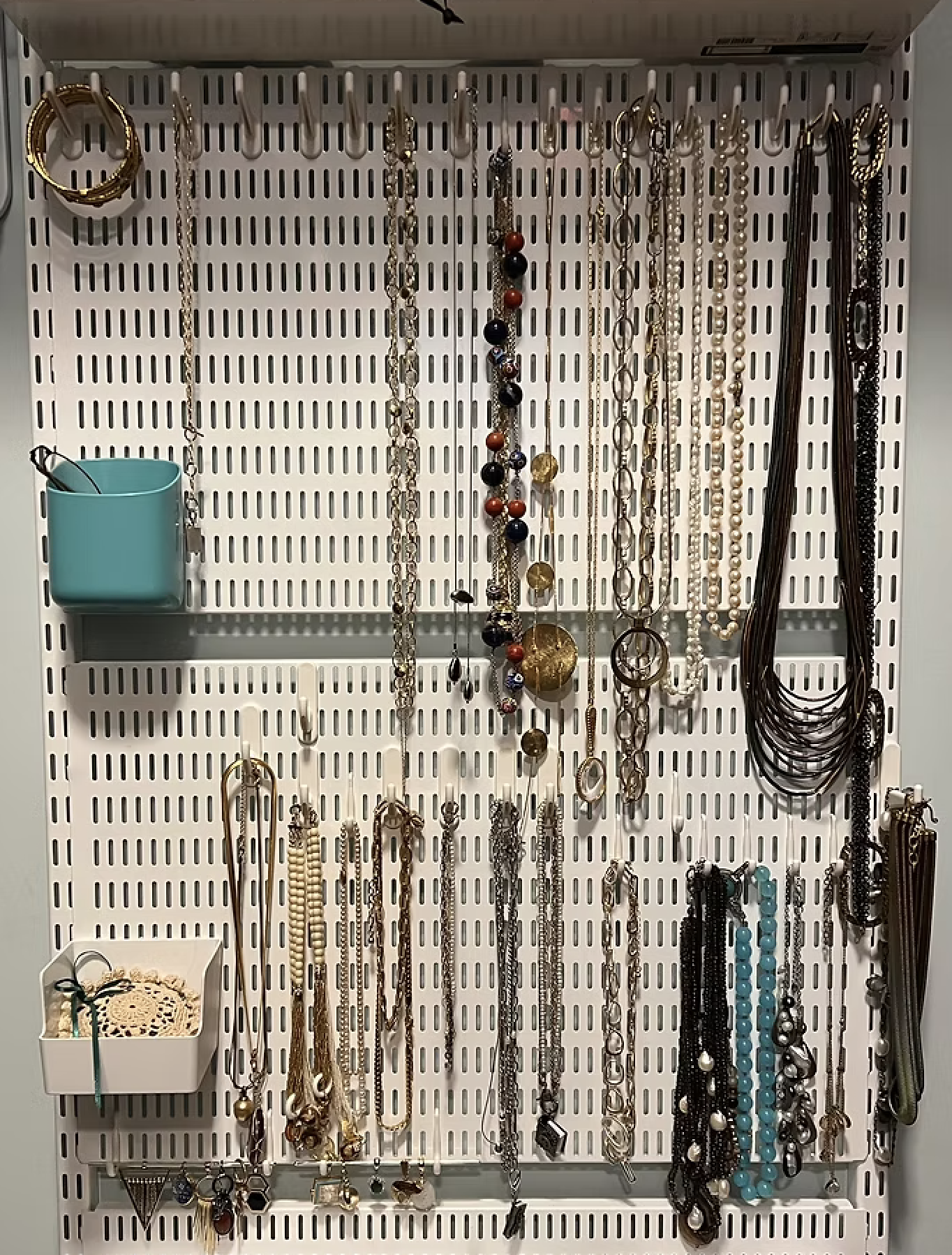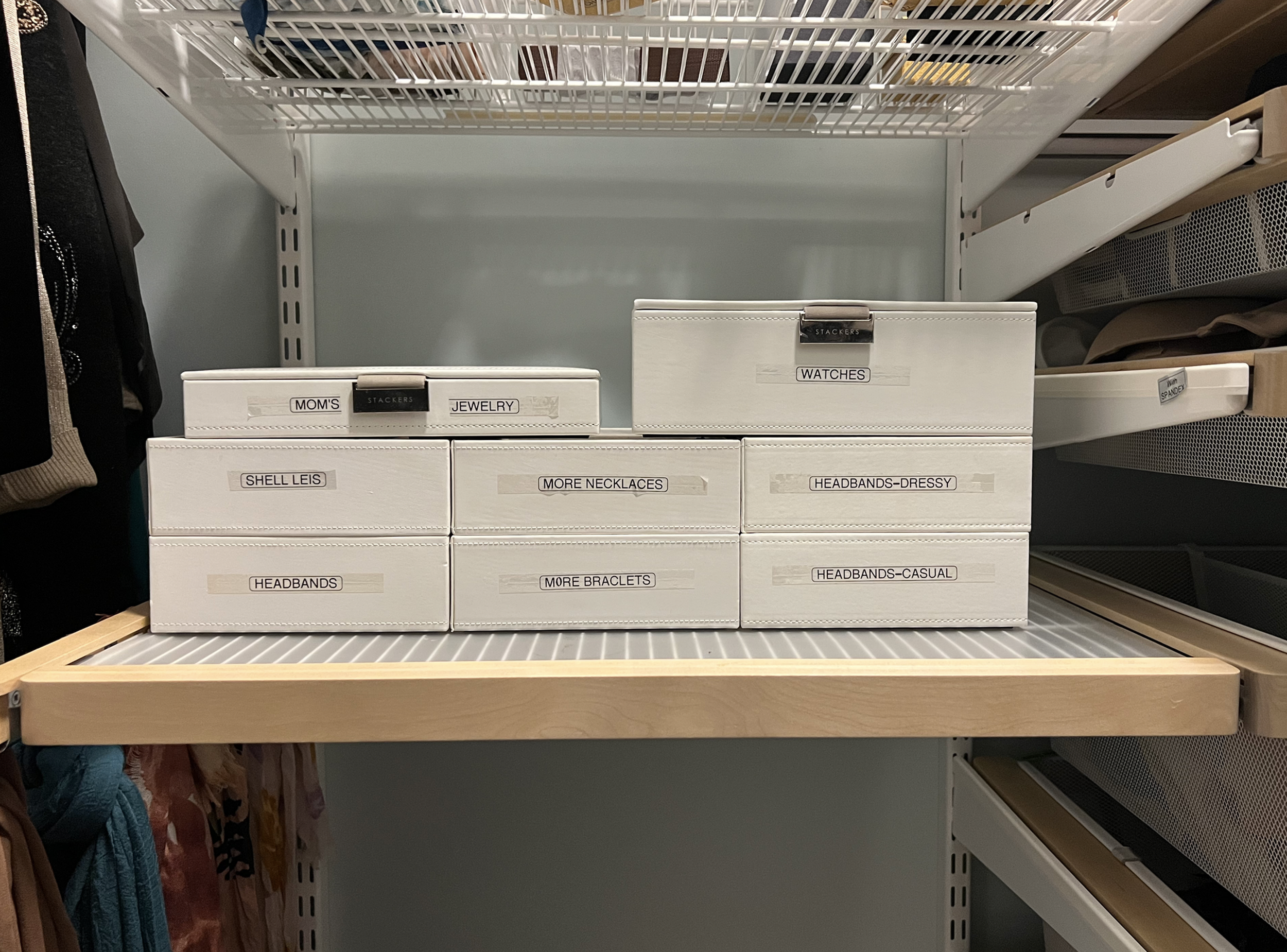 Not like now, when every time I walk into my closet, I see a special rack on the back wall for necklaces, two Elfa-designed jewelry trays made to fit my ever-evolving Elfa closet system, and six white leatherette boxes (with labels of course) for watches, bracelets and necklaces that don’t fit into the racks and trays.